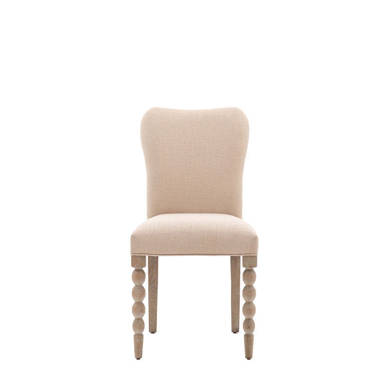 Elevate your dining space with this pair of hand-crafted chairs, each featuring a generously upholstered seat paired with sculptural oak legs finished with delicate bobbin detailing. The combination of soft, enveloping upholstery and natural wood joinery creates a sophisticated balance between comfort and craftsmanship. These artisan pieces work beautifully in both modern and traditional settings, adding character and warmth to any dining arrangement.